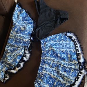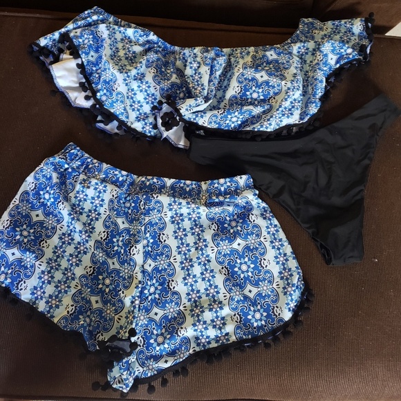 Cute swim suit. Off shoulder top w built in pads, bikini bottom, and swim shorts. Brand new. Never worn. Bought for cruise. Came after cruise. Cant return (online purchase). Too young for me!!!!
