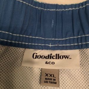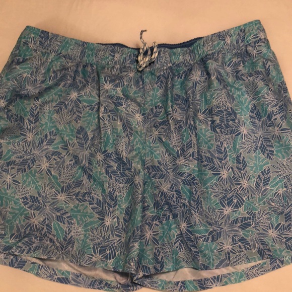 Men’s swim suit, worn exactly one time at the beach! Side pockets and a rear pocket with inner lining. They are a light blue, sea foam green and white colors elastic waistband and tie to cinch tighter.