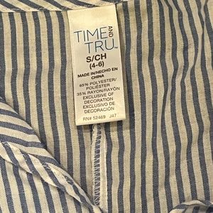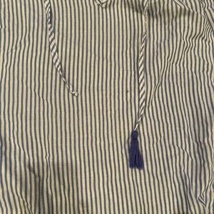 Navy and white striped cover up. Missing a tassel on one of the strings.