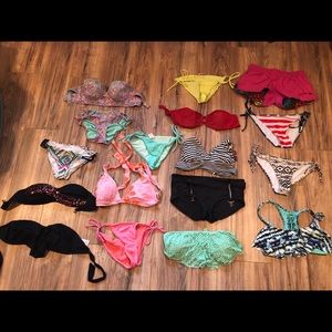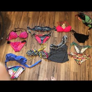 58 pieces of swimwear total. There are 12 sets that have a matching top and bottom, 11 just misc. bottoms, and 23 misc tops. Brands include Victoria secret, target brands, American eagle, hula girl, and Belk brands! Tops fit when I was a full b/c and now I’m a DD and that’s why I am selling. Bottoms are s/m depending on the fit. Make me an offer! I just really want to get them out of my closet! Also comes with a over the door organizer as seen in photos. Read Less