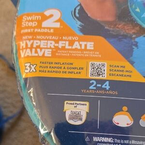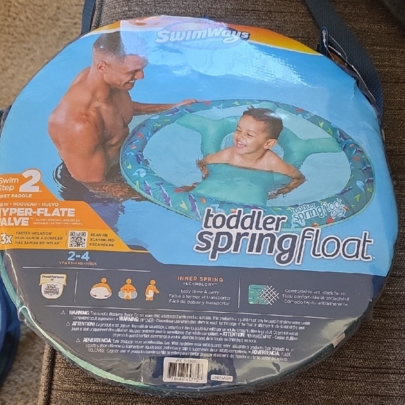 SwimWays Toddler Spring Float in green patterned fabric. Comfortable inner spring support for young children. Easy to inflate and carry for pool and lake use. Designed for stability and safe play in the water.