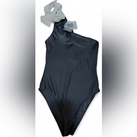 Elegant black and white one-shoulder swimsuit featuring a stylish white bow detail.