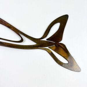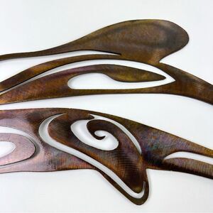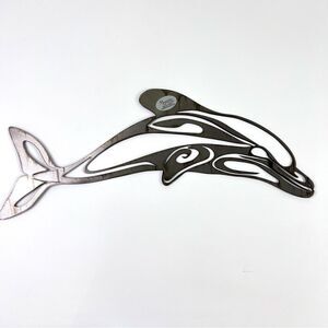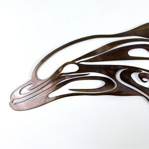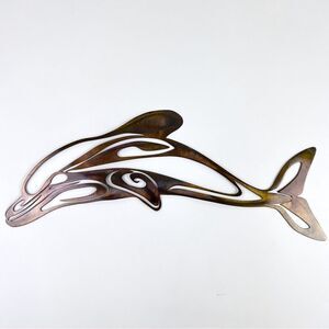 Dolphin metal wall art, coated. Machine/plasma cut. Approx 27.5” inches from tip to tail, and 9” inches wide . Finish coating shows light wear. Pre-owned in used condition. See all pictures for description and condition.