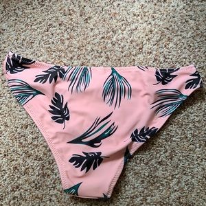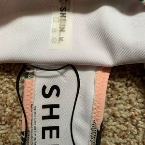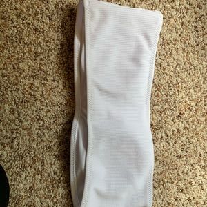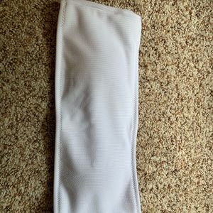 Top and bottom matching suit. Top is a white bandeau that comes with padding. Fits true to size(medium) Bottoms are mediums as well but fit more like a small. Never worn. No stains.