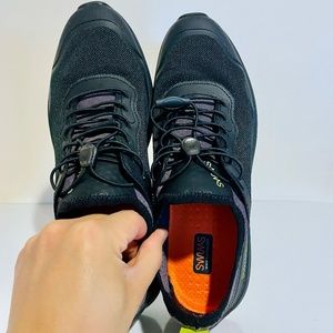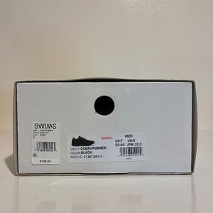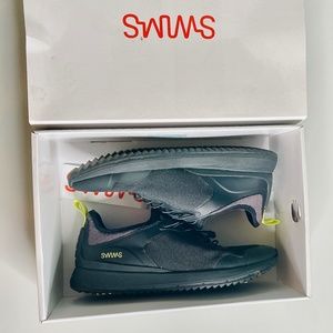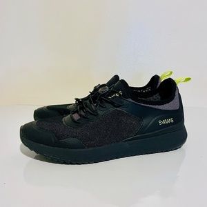 Swims Black Ocean Runner Men's Sneakers in Size 7. Color is black with neon yellow accents. Sneakers are ultra lightweight and have a no-tie lace/cord system. Great for wet or dry conditions. The innovative style features an open nylon mesh upper with Breeze technology. A drainage outsole allows water to run through the pair easily, while a responsive EVA outsole and heavy duty treads provide comfort. Bottom outsole measures approximately 11 inches long (photo 11). Comes with box. Pre-owned in very good condition - only worn out once. Original MSRP $198.