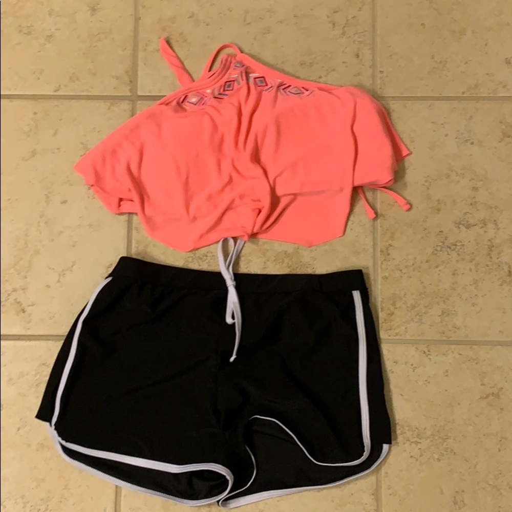 Neon halter bikini top whit fringe and black sport/swim shorts. The top is slightly worn, but the bottoms have never been worn. They came as a separate set, but I’m selling them together!