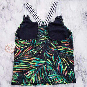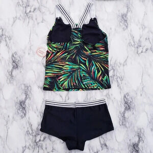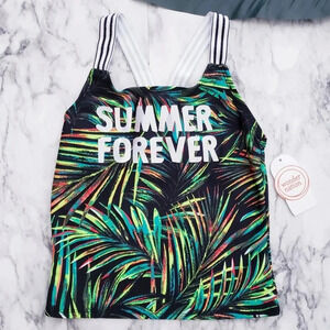 New With Tag, Wonder Nation Summer Forever swimsuit two 2 piece set tankini bathing suit top and bottom, black green palm print, silver foil rubber "Summer Forever" print spell out, bottom sporty boyshort style.