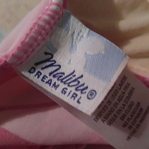 Tankini top with padding, regular bottoms with cute ties on the sides. Pink with some red flowers and white,