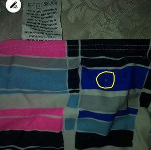 Two piece, tie center. Last two pictures have a discolor on swimsuit. Unnoticeable