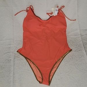 Comfy nylon with the right amount of stretchBraided, adjustable shoulder tiesCrochet trim at necklineGold binding at leg openingsColorblocked! (Back feats. different color than front)