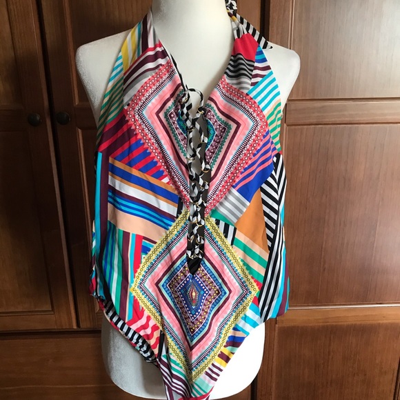 Multi color full piece bathing suit with halter top.
