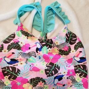 Excellent condition. Size 6-6x vibrantly colored with animals 2 piece swimsuit #0550x