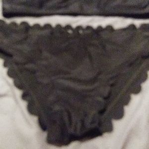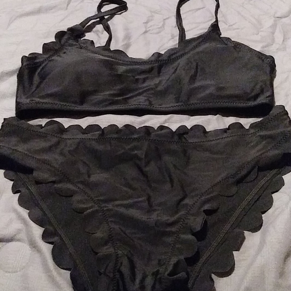 Solid black two-piece swimsuit outer design top just pulls over head