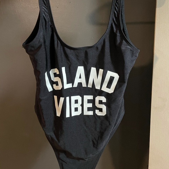 Black swimsuit with Island Vibes saying on the front. This bathing suit features a low scoop neck at front, cut high at the legs and low in the back — Swimsuit is not see through!