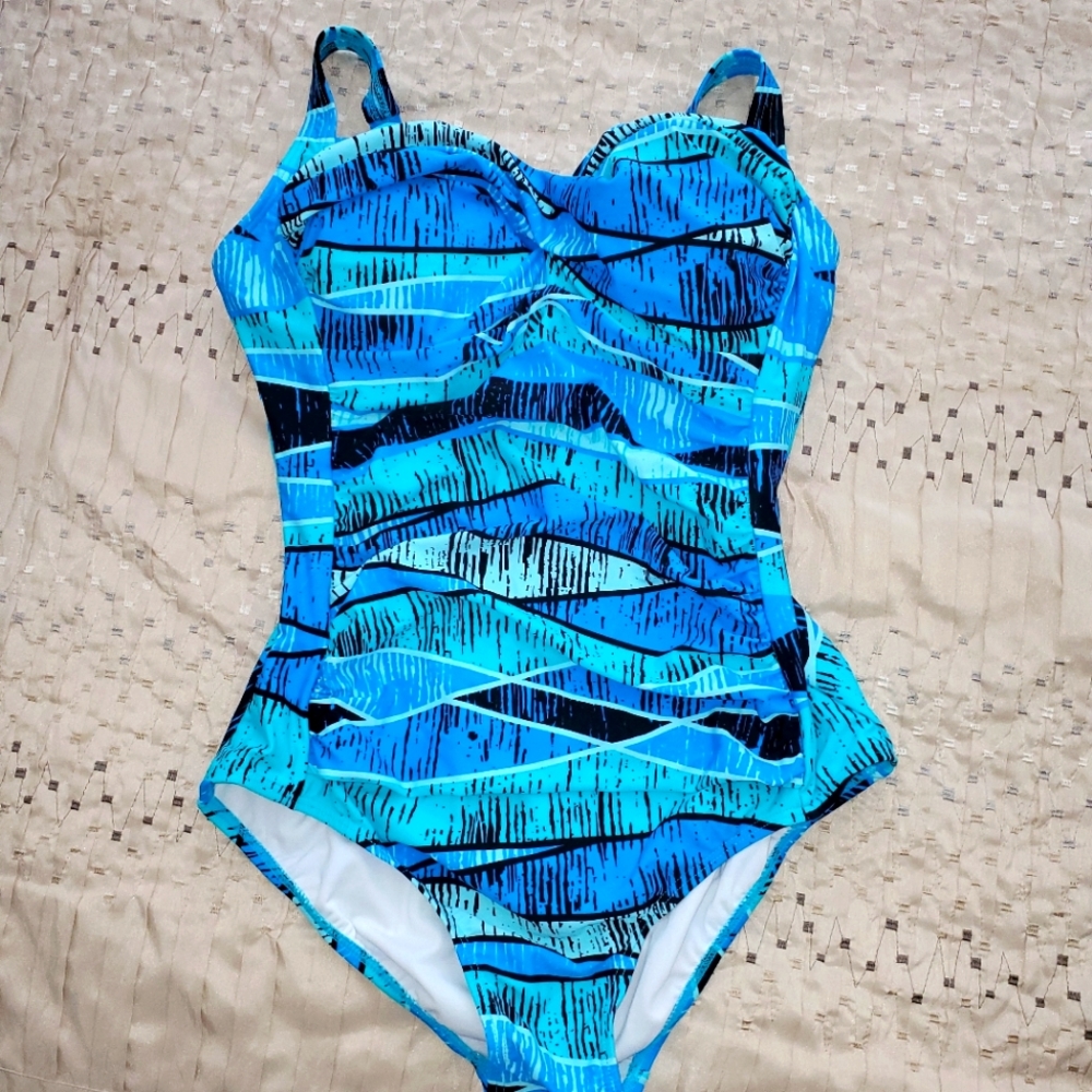 Shades of blue full size swimsuit with ruching detail, sturdy straps and molded bra cup. Very flattering.