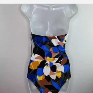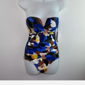 Featuring a vibrant, stained glass-inspired print, this bandeau swimsuit boasts a flattering crisscross-front design and ruching.