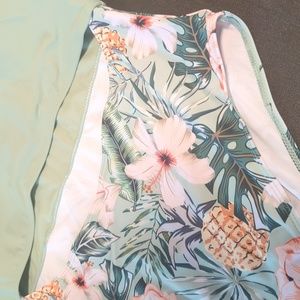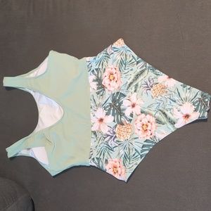 Removable cups. Sage green. Tropical print. One piece with a mid-section cut out.