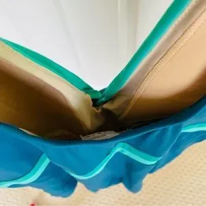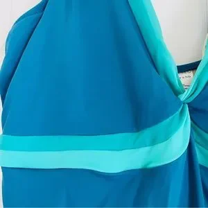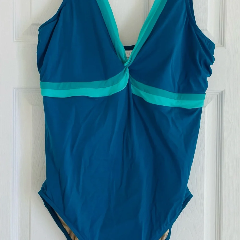 Pristine one-piece swim suit from Lands’ End with fully lined slimming tummy control and shelf bra. Marine blue and shades of green. Worn a time or two if at all. Quality swimsuit.
