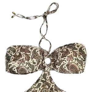 Swimsuit, Swim, Suit, Bathing Suit, Halter top, Gold Colored Ring, Adjustable Slide Closure, Cut Out Sides, Cheeky Rutched Bottom Detailing, Paisley Print, Beaded Strap Accents, Soft, Stretch, Beach, Pool, Vacation, Travel,