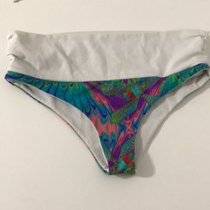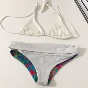 Súper cute reversible swimsuit, I purchased it at a boutique in the Bahamas, the brand is Caffe, size M but fits more like S, I am also including a plain white triangle top from VS(size M) as a bonus in case you want to wear it all white 😉 Please note that I removed the tag off the bottoms to wear them on both sides.