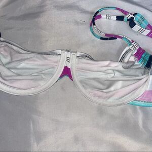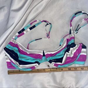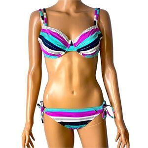 Multi Stripe Underwired Bikini by s.Oliver RED LABEL. EUC. This fashionable underwired bikini comes in a modern stripe design in contrasting shades of teal, pink and white for a real stand out seaside outfit. The top comes with gathered cups for an amazing cleavage, practical adjustable double straps and the matching briefs have a flip waistband for flattering coverage and an extra boost for confidence. Perfect to add to your Beachwear collection for the summer! SZ SM - See measurements in pics