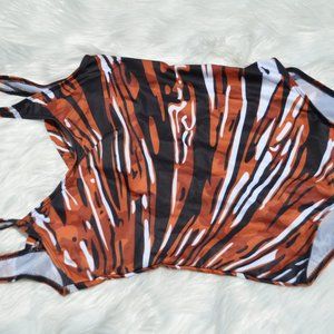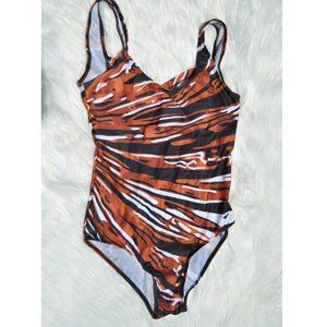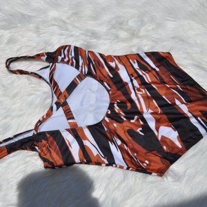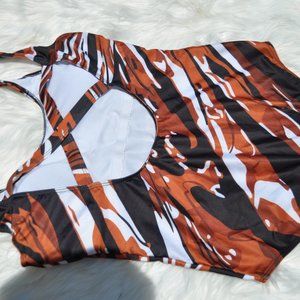 Brand new women's Swimsuit One Piece High-Waist Swimwear Tummy Control Soft Bra Padded Monokini Sexy Cross Lace Up Low Back Bathing Suits elastic and quickly dry fabric:82% Polyester, 18% Spandex soft Bathing Suits with a chest pad, the flesh of your chest may not be able to control the sagging. Black Brown Striped SIZE LARGE