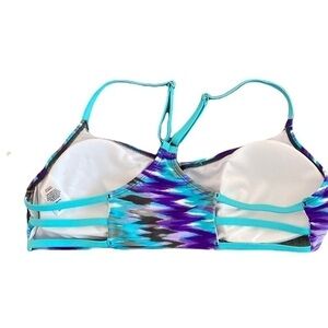 Swimsuit racerback top. Adjustable straps. Strappy back. Soft molded cups. Gorgeous colors purple and teal. Size L