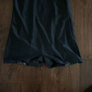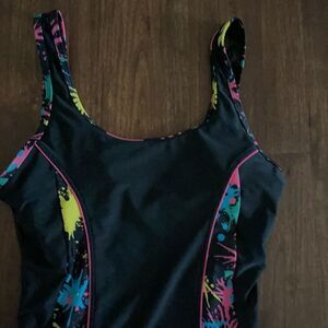 Stylish One piece swimsuit in black. It is accentuated with colorful designs around the neck arm line and side panels. Built in bra. Note the bottom leg area of the swimsuit. It has a tank affect.