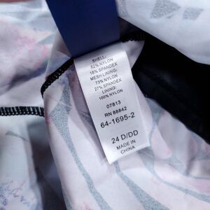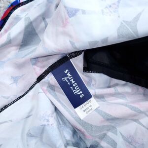 Swimsuits for All Tie Front Underwire Tankini top with lined or padded cups. Red, blue, purple and black tropical palm print. In good used condition with no flaws noted. Women's plus size 24D/DD. Please see Swimsuits for All size chart in photos for details.