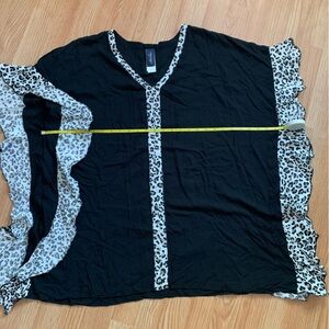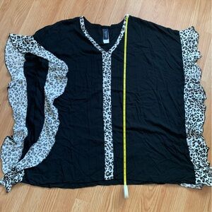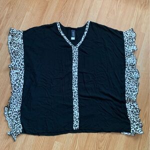Pullover, loose fitting swimsuit cover up/dress. V-neck, Animal print trim around collar, middle and waterfall sleeves, side slits.