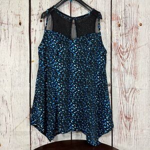 This sleeveless blouse from Swimsuits For All showcases an elegant asymmetrical hemline and is with blue & white polka dot pattern on black. The graphic, combined with sheer mesh detailing at the neckline and shoulders, offers a sophisticated and stylish look that makes this swimsuit top not only good for the beach and pool side but also great for a night out.