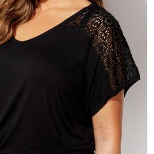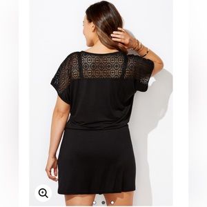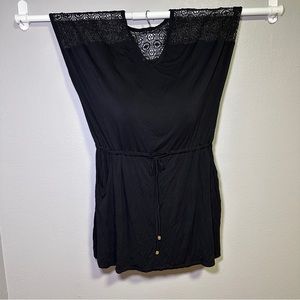 Chic black mini dress. Features lace shoulder detail. Comfortable and stylish.