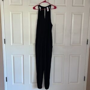 Swimsuits for all black sleeveless jumpsuit. V neck detail. Back button closure. Side hip pockets. Elasticized ankle openings. Size 14/16. 20 1/2” armpit to armpit laid flat. 15 1/2” elasticized waist laid flat. 58” shoulder to ankle hem. Gently used condition