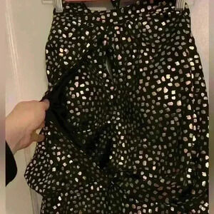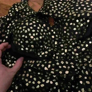 All over gold and black style. Halter tie (loose thread as shown), keyhole, cross over wrap top, molded cups, elastic band on the back, blousy style top.