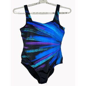 This new without tags Swimsuits For All women's plus size 20 one piece swimsuit is perfect for your beach vacation. It features a wireless padded top and full coverage bottom. The blue and purple colors on the black add to the beachy vibe.