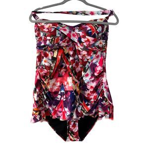 Make a splash in this Swimsuits for All Shore Line Multicolor Floral Backless Swim Dress. Featuring a vibrant tropical floral print, this flattering swim dress includes a backless design with adjustable neck strap, a built-in shelf bra for support, and a flowy A-line skirt for extra coverage and feminine flair. Size 18, perfect for poolside lounging, beach days, or tropical getaways.