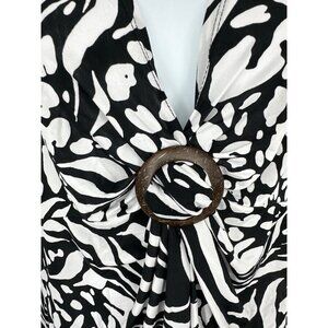 This cover-up dress features a stylish animal print design in black and white with a wooden ring accent. Designed for wear over swimwear, it combines elegance and comfort.