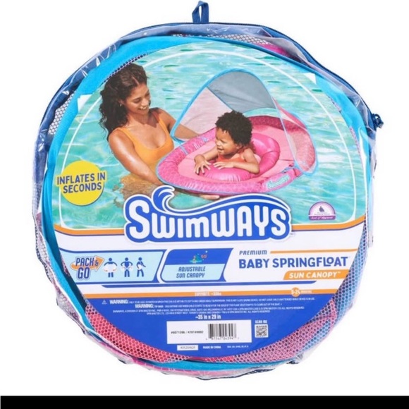 Swimways baby spring float with adjustable sun canopy. Features a pink float with blue accents.