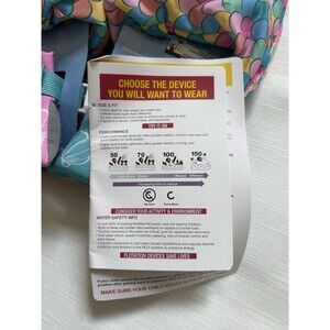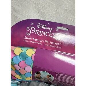 This kids life jacket was designed specifically for younger swimmers, it works to build confidence while learning to swim. US Coast Guard approved as a safety flotation device so parents can relax with confidence while their kids are in the water. Features and easy on and off design, shoulder straps for a secure fit, and a flexible design for comfortable movement. This flotation device comes in Disney Princess the little mermaid Ariel scales print and fits one size weight of 33 to 55 pounds. Brand new with all original tags including important information about childrens PFDs. Comes from a smoke free home.