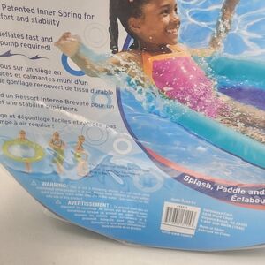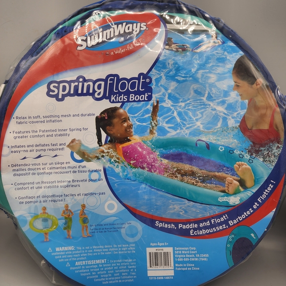 New in original package, splash, paddle, and float with the SwimWays Springfloat Kids Boat. It features soft, soothing mesh, inflates and deflates easily without a pump, and features Swimways patented inner spring design. This oval-shaped float in blue green is designed for kids ages 5+ years old, providing a fun and safe way to enjoy the water. With the SwimWays brand reputation, this spring float is sure to be a hit with families looking for a quality and durable water toy.