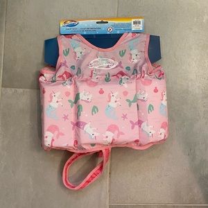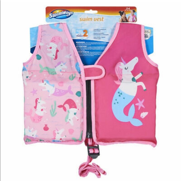 The Swimways Learn to Swim Vest, Pink Mermaid Unicorn helps build confidence in kids as they learn to balance and paddle in the water, featuring soft fabric providing UPF 30+ sun protection.