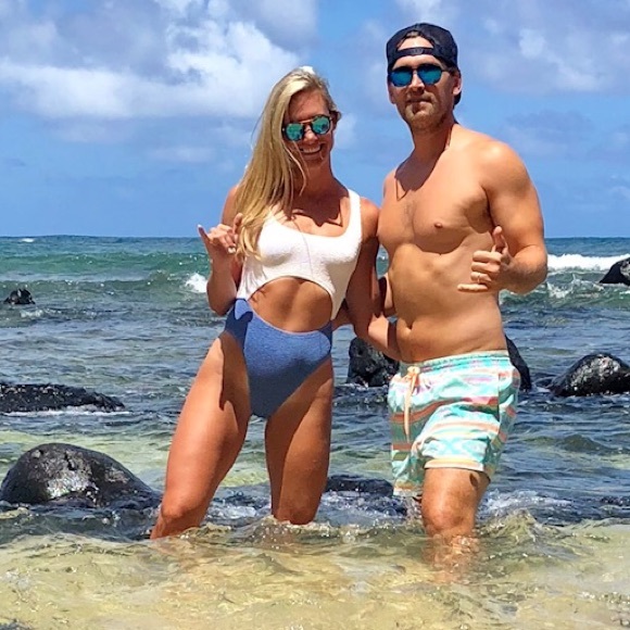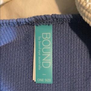 One size fits all Bound ribbed blue and white one piece swimsuit. Stretchy and really comfortable. Worn one time on my honeymoon. No wear or tear, in excellent condition.
