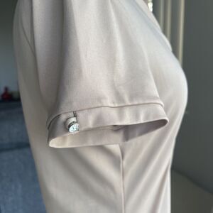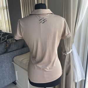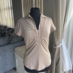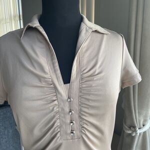Swing Golf Beige Short Sleeve V-Neck Collared Rhinestone Buttons Blouse S