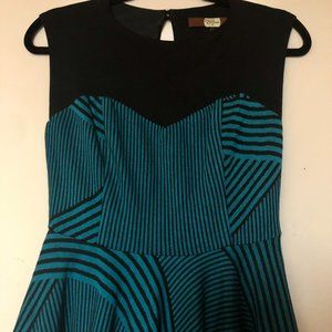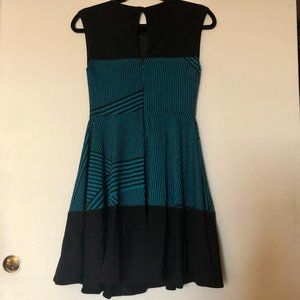 Classic striped swing dress as seen on Pretty Little Liars and worn by the lovely Aria Montgomery. Featuring black and teal stripes, a high neck, color blocking throughout, and a classic a line skirt. Channel your inner mystery solver in style with this unique and flattering dress.