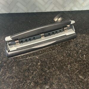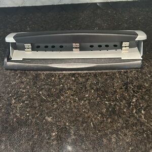 Efficient and durable hole punch in sleek silver and black design. Perfect for organizing documents with ease.