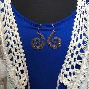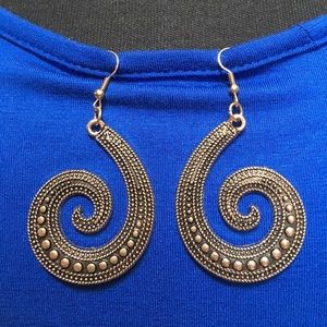 Swirl Statement Pierced Earrings look of Antique Gold. Approximately 2 3/4" long x 1 1/2" wide. Light weight for their size. Never worn. Also have Silver tone ones. Bundle with another ring or earrings or item that has this special. First one is $13.00 second one you get both for $20.00