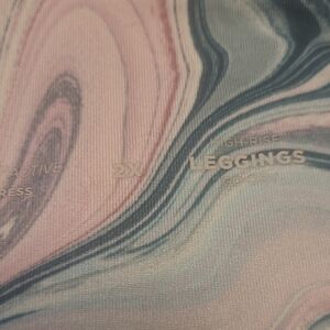 Stylish leggings with a swirled pattern in pink, blue, and white.