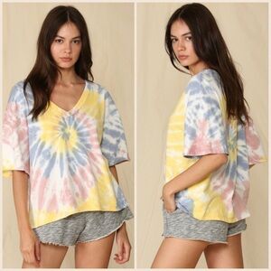 Swirls of Lemon, Navy & Mauve Tie Dye French Terry (Real French Terry) Knit Short Sleeve Top. Top has real substance though. See pics. Raw seams, v-neckline & croppish, just not long. Hand dyed fabric of beauty. This will be your new fave! Guarantee!! Love the texture inside & out. Soft outside, terry inside, boxy fit.