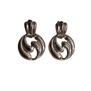 Very chic and stylish door knocker derivative earrings with wonderful design embellishments. Beautiful silver plated on these earrings––in fact, the workmanship and detailing is first class! It looks like a possible logo at the base of the earring tops but I can't decipher it (if it is!). The earrings have post backs and the earrings are in excellent vintage condition. Measurements are 1 1/4 inches by 1 inch and each earring weighs 13 grams. These beauties will be wrapped in a pretty gift pouch and email questions are always welcome.