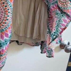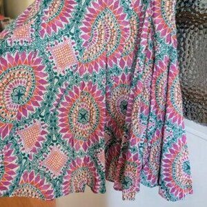 Lovely Anthropologie summer sundress by HD in Paris. Sleeveless pink and orange confection with a swingy, swishy skirt. The whole dress is soft and the pretty outer fabric is fully lined with a soft cotton slip. The side zipper makes it easy to put on. Medium-deep scoop-neck front and back (cover photo is taken with a camisole that is NOT included). Soft and drapey cotton voile printed with lively color---floral beige w/ orange & pink. Perfect party dress, perfect condition, super comfortable, suitable for any age. Size 8.